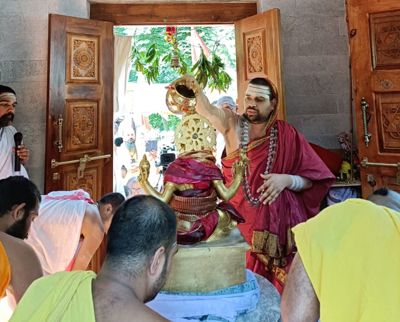 TEETWAL, June 5: Sri Sri Vidushekara Bharathi, Shankracharya of Sringeri here today performed Abhishek Puja and Pran Pratishtha of idol of Goddess Sharda at Sharda temple on LoC in Teetwal, Kashmir. A large number of followers of Shankracharya, devotees and locals of the area also took part in the rituals.