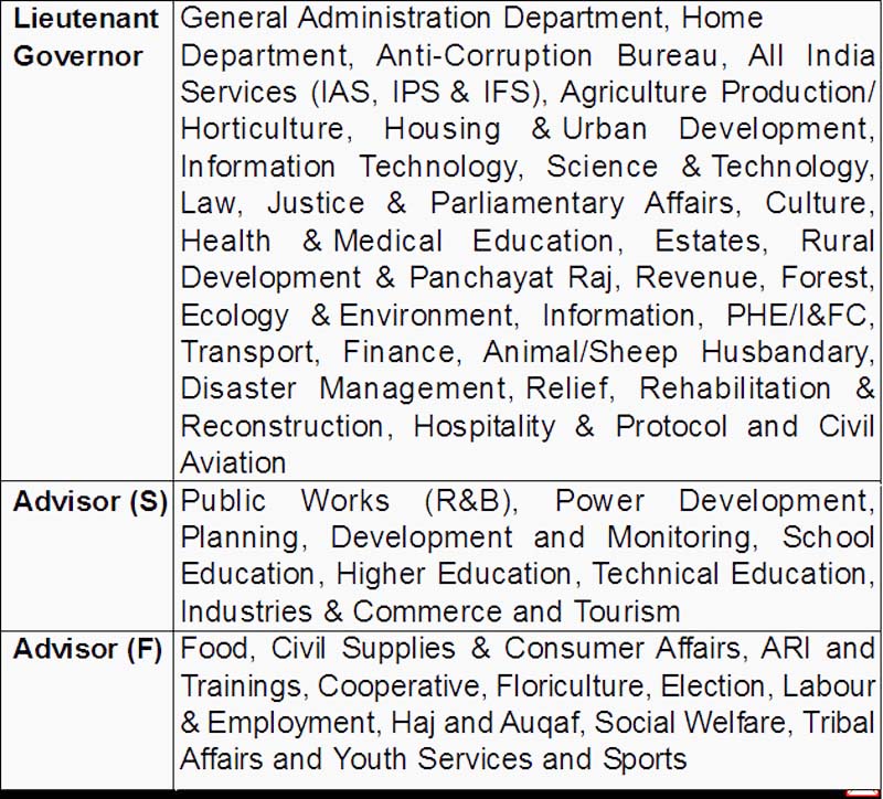 Second Advisor Farooq Khan has been allocated Food, Civil Supplies and Consumer Affairs, ARI and Trainings, Cooperative, Floriculture, Election, Labour and Employment, Haj and Auqaf, Social Welfare, Tribal Affairs and Youth Services and Sports Departments.