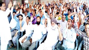 NMC workers raising slogans during a meeting at Jammu on Sunday.