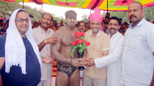 Shiv Kumar Sharma awarding Wrestler Benia Min.