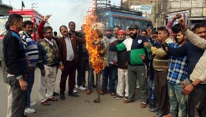 JAMMU, Jan 5: Shiv Shakti Sena (SSS) held a protest against Shaukat Hussain MLC of National Conference under the leadership of Rakesh Gupta President of Shiv Shakti Sena at Janipur Mainstop near Saguaat, today.