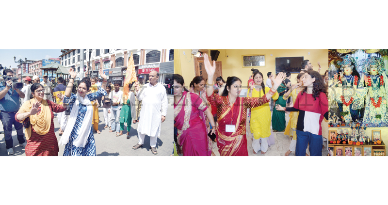 Shoba Yatra being taken out on the occasion of Krishna Janamashtami in Srinagar (left) and the devotees celebrating Janamashtami at ISKCON temple Dream City Muthi in Jammu (right) on Friday. -Excelsior pics by Shakeel & Rakesh