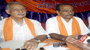 President, Sanatan Dharam Sabha, Jammu, Jagdish Dogra alongwith another office bearer addressing media persons at Jammu. -Excelsior/Rakesh