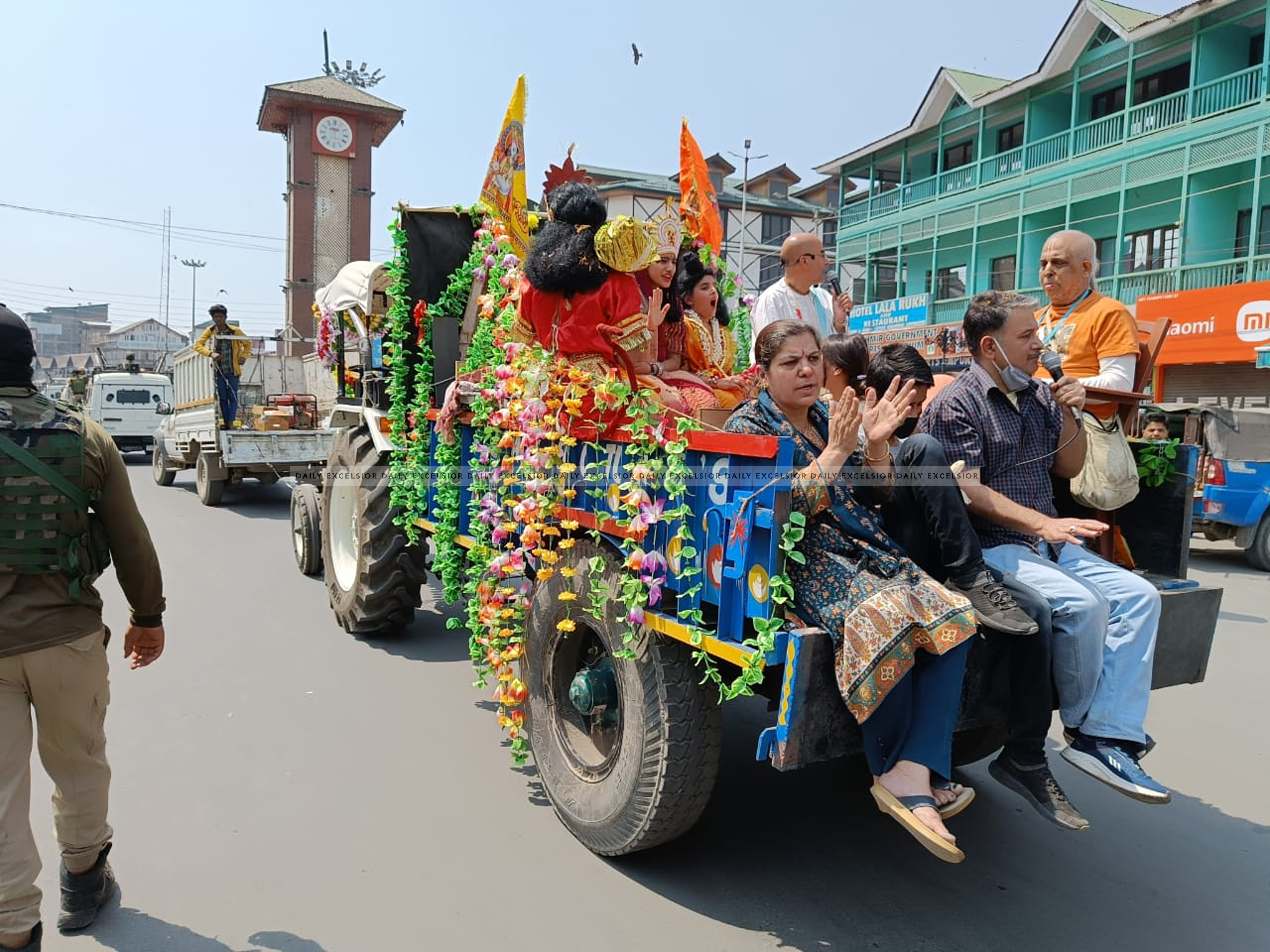 The Yatra with a group of children dressed in traditional attire was taken out from Kathleshwar temple in Tankipora area in Srinagar and passed through the roads of Habbakadal, Ganpathyar, Barbar Shah, Regal Chowk, Lal Chowk, Hari Singh High Street and Jahangir Chowk amid tight security arrangements.