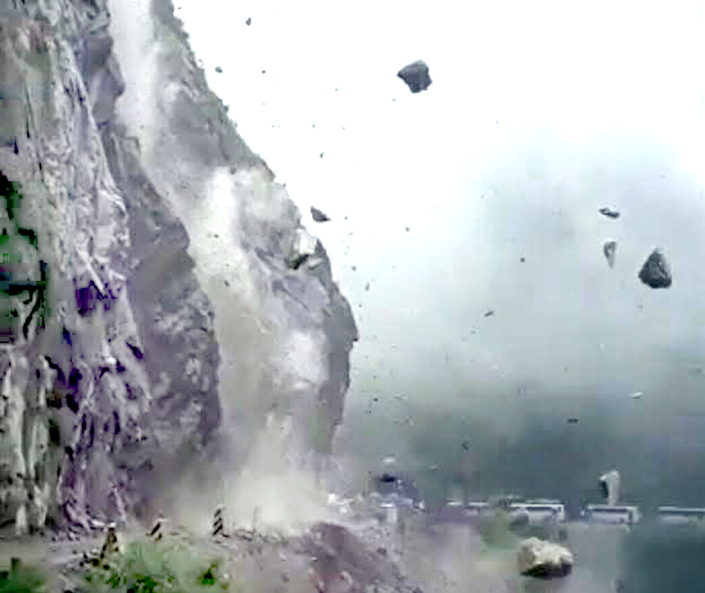 Shooting stones at Panthyal near Ramban on Jammu-Srinagar National Highway on Sunday following heavy rains. —Excelsior/Parvaiz Mir