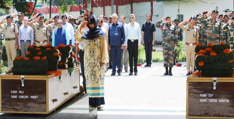 Mehbooba and her deputy Nirmal Singh, joined Chinar Corps Commander Lt. Gen. J S Sandhu and officials from civil and police administration, to pay rich tributes to Major Pandey and Sepoy Tanzin Chhultim, in a solemn ceremony at Badamibagh cantonment here, an Army official said.