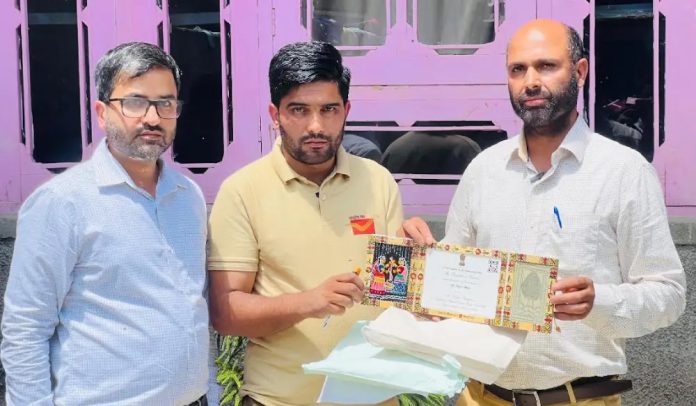 The postal team delivering the invitation comprised Postman Maqsood Jehra, Subdivision Inspector Imtiyaz Ahmad, and Postmaster Farooq Ahmad.