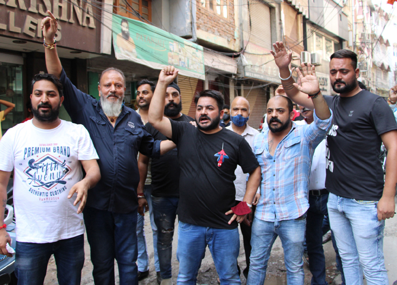 JAMMU, Sept 2: The irked shopkeepers and residents held protest against Jammu Municipal Corporation (JMC) for dilapidated condition of road in Jain Bazaar area here.