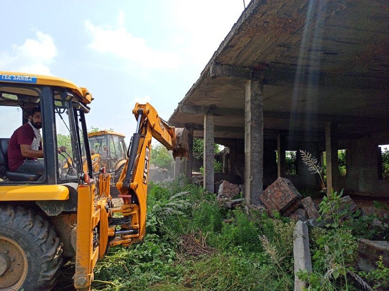 The drive was launched under overall supervision of the Deputy Commissioner, Samba, Rohit Khajuria. The anti encroachment team today dismantled an illegal shopping complex constructed over nine Kanals of State land bearing Khasra Number 702. The shopping complex had seven pacca shops with a hall measuring 100x 60 feet measurements which were demolished during a three hours long anti encroachment drive.