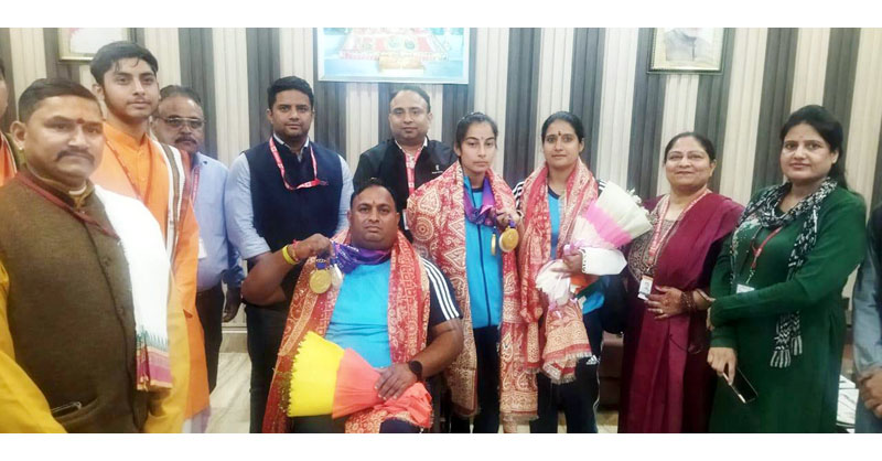 REASI, Nov 2: Shri Mata Vaishno Devi Shrine Board’s Para archers Sheetal Devi and Rakesh Kumar received traditionally welcomed by higher officials of Shri Mata Vaishno Devi Shrine Board on behalf of Chairman, SMVDSB (Lt. Governor, JK-UT) with garlands and Tilak amidst chanting of Vedic mantras at Jammu Airport for their outstanding performance at the Para Asian Games in Hangzhou, China.