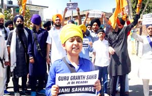 JAMMU, Mar 26: Annoyed over the incident of burglary in a Gurudwara in Kashmir and the disrespect shown towards the Sikh’s religious books and other holy items, Sikh Youth Sewa Trust (SYST) today staged a protest against the culprits at near Gurdwara Nanak Nagar, Jammu today and demanded immediate action against the accused.