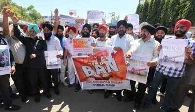 The members many Sikh bodies including  Sikh United Front J&K, Shiromani Akali Dal J&K Unit,  Sikh Naujwan Sabha, Bhai Kanhaiya  Nishkam Sewa Society  J&K, AISSF, Sikh Welfare Society, Members DGPC Jammu and J&K Motor Transport Company Association Jammu assembled near Press Club Jammu  and  held a strong protest demonstration  against  the release of film- ‘Baba Nanak Shah Faqir’.