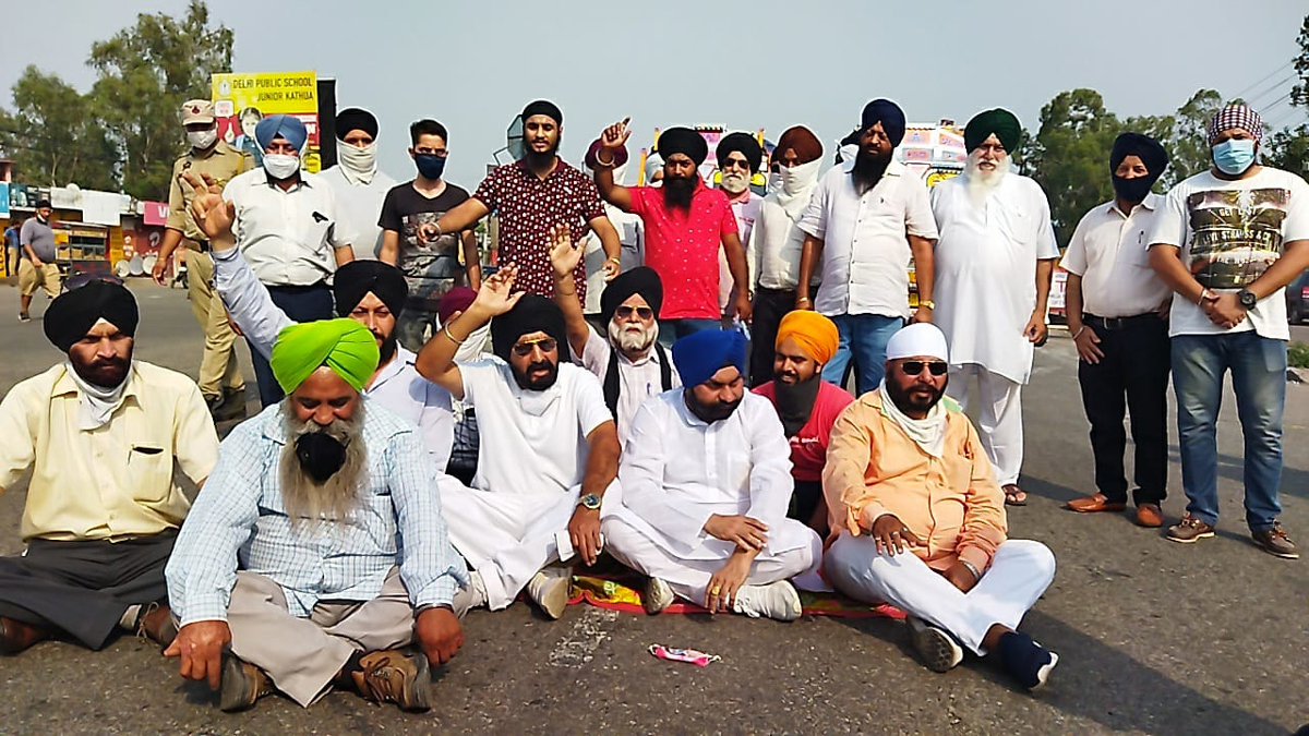 Sikhs protesting at Hatli Morh Kathua on Monday. —Excelsior/Pardeep