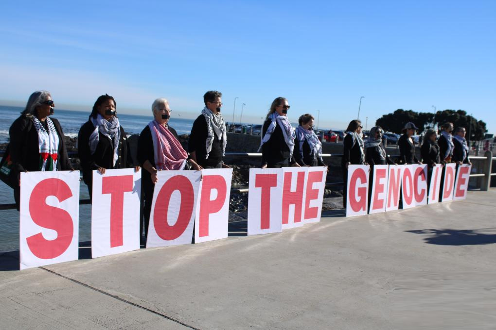 With their mouths taped shut, the women stood in Sea Point holding placards that collectively spelled out “STOP GENOCIDE.” Some held graphic images of emaciated children and adults, reportedly starved due to the Israeli blockade on food and humanitarian aid.