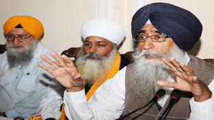 Simranjit Singh Mann, president Shiromani Akali Dal Amritsar, along with his senior party leaders addressing a press conference at Srinagar on Tuesday. -Excelsior/ Amin War