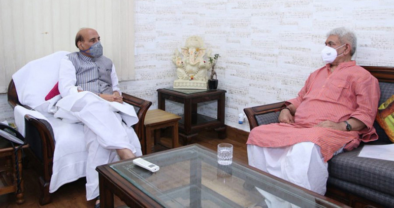 JAMMU, Sept 26: Lieutenant Governor Manoj Sinha today called on Defence Minister Rajnath Singh and discussed with him the militancy related situation as well as the prevalent scenario on the Line of Control (LoC) with Pakistan in Jammu and Kashmir.