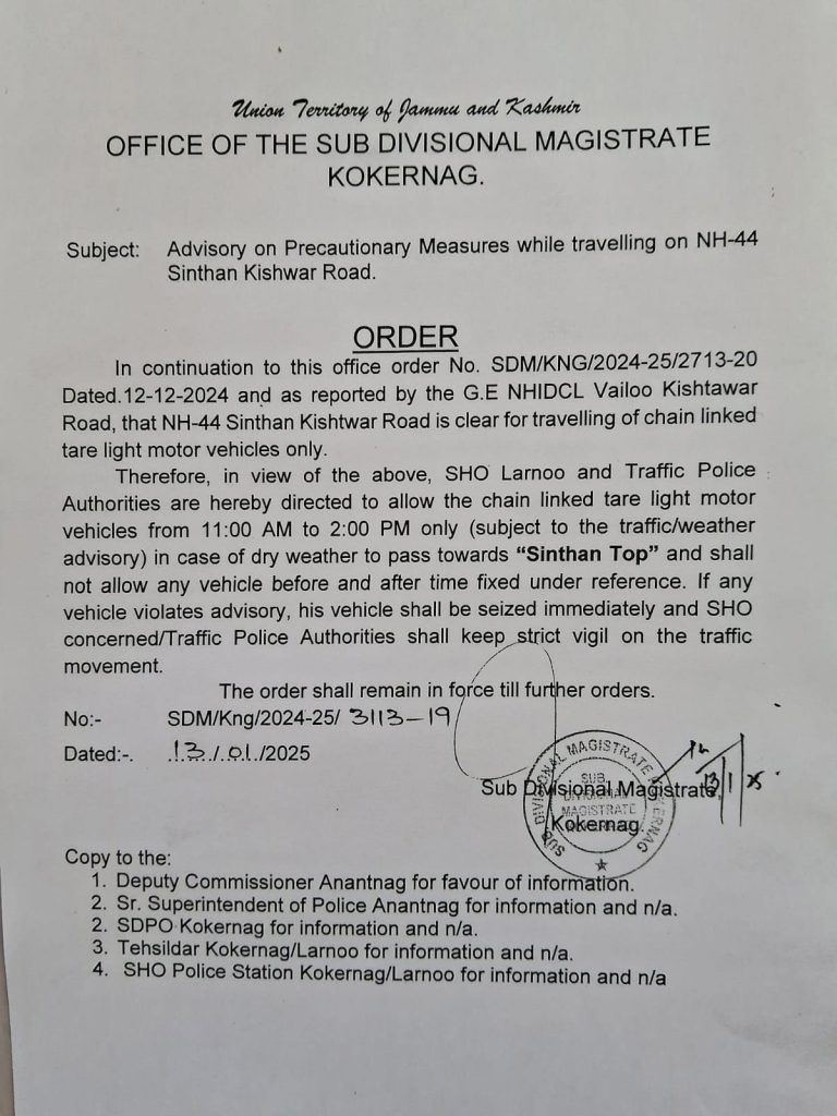 As per the advisory vehicles will be allowed to move between 11:00 am and 2:00 pm, provided weather remains clear. Traffic Police and SHO Larnoo have been directed to ensure strict compliance with the timings and seize any vehicle violating the directive. (KNO)