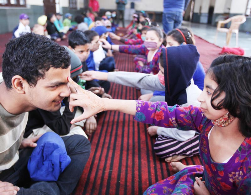 Sisters offering Tilak on the foreheads of their brothers on the occasion of Bhai Dhoj at Bal Ashram Ambphalla on Monday. -Excelsior/Rakesh