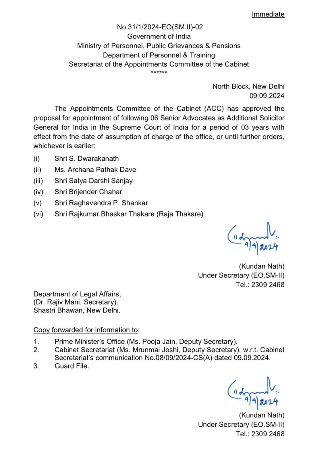 Those appointed are S Dwarakanath, Archana Pathak Dave, Satya Darshi Sanjay, Brijender Chahar, Raghavendra P Shankar and Rajkumar Bhaskar Thakare (Raja Thakare), the order said.