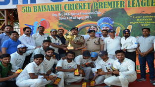 Skipper KC Sports Club Arjun Choudhary receiving trophy from IGP Jammu, SD Singh Jamwal alongwith his team members and other dignitaries and officials in Jammu on Monday.