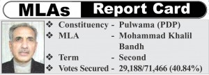 People had in 2008 Assembly elections voted PDP’s incumbent MLA Mohammad Khalil Bandh to power. Bandh had defeated the Congress candidate Sonaullah Dar by a margin of 6636. He had polled 10639 votes, while Dar got 4003 votes.