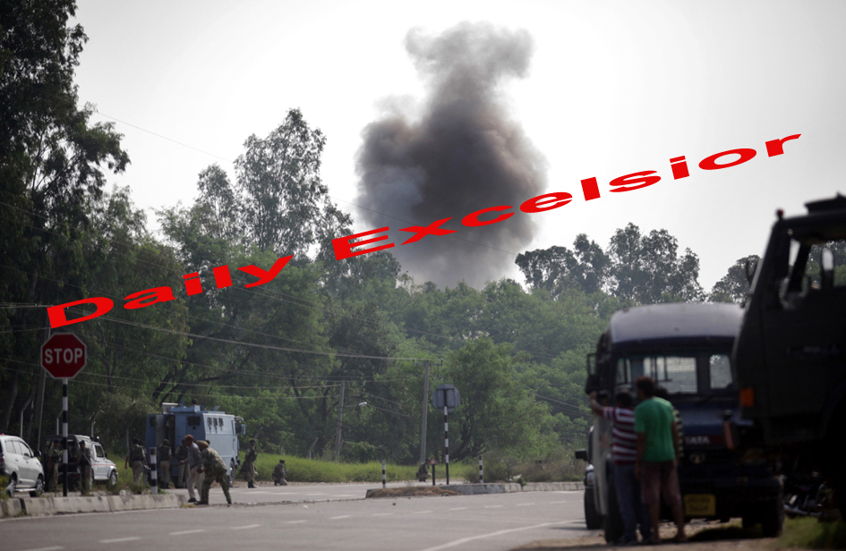 Smoke comes out at Army camp, some samba 40 Kms from Jammu after Indian army persnals fire mortar shells on militants hided in the camp on September 26 2013. Excelsior Rakesh