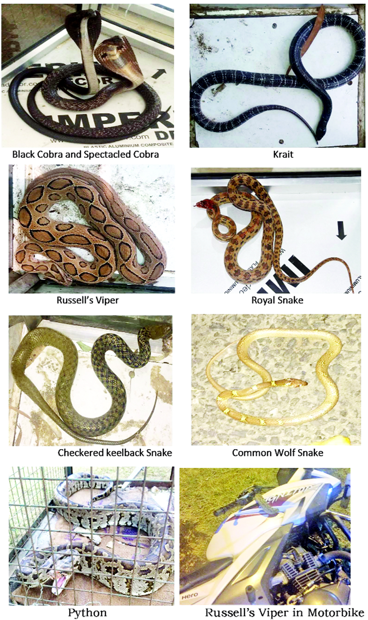 The 530 number of snakes that have been rescued belong to 13 species, out of these, three species are poisonous in nature i.e Cobra, Russell’s Viper and Common Indian Krait. About 95 no. of cobras (Spectacled cobra and Black Cobra), 82 no. of Russell’s Viper, 2 no. of Krait have been rescued. The 11 non-poisonous species of snakes have also been rescued which includes Indian Pythons (23 no.), Royal or Diadem Snake, Common Wolf Snake, Common Rat Snake, Cat Snake, Checkered Keelback Snake, Russell’s Earth Boa, Common Sand Boa, Common Banded Kukri and Trinket.