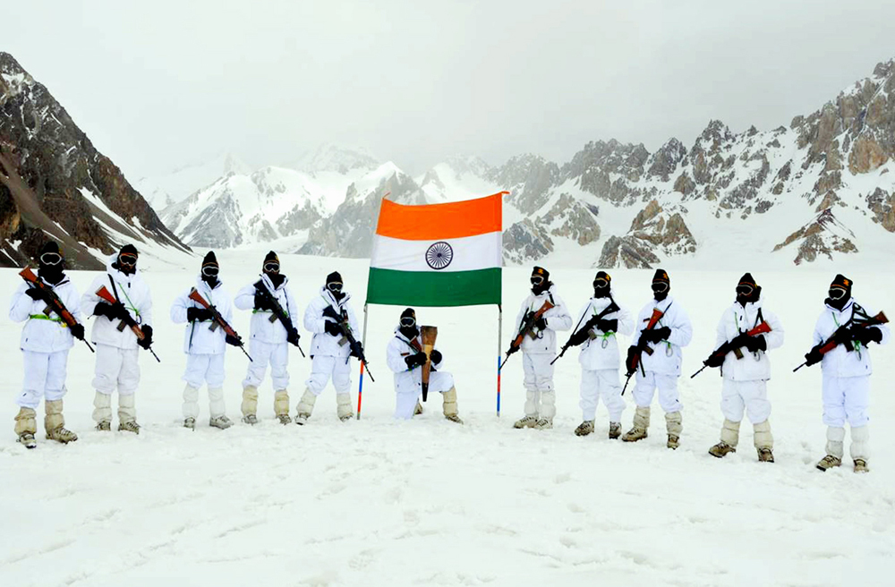 Soldiers holding the ‘Swarnim Vijay Victory Flame’ commemorating 50 years of Indian Armed Forces victory over Pakistan in 1971 war reached the frozen frontiers of Siachen Glacier in Ladakh on Tuesday. (UNI)