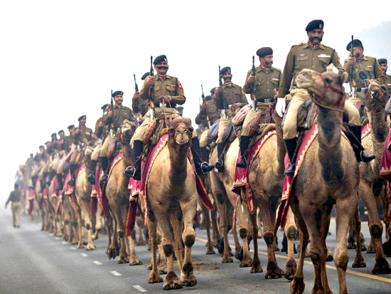 Soldiers ride their camels as they take part in the rehearsal for the Republic Day parade on a cold winter morning in New Delhi on Thursday. (UNI)