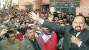 Som Nath addressing the PHE employees rally at Udhampur on Friday.