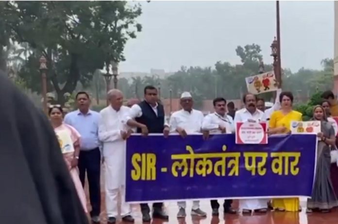Ahead of the day’s proceedings in Parliament, Sonia Gandhi, Priyanka Gandhi Vadra, Samajwadi Party chief Akhilesh Yadav, and other opposition MPs raised slogans and protested against the Special Intensive Revision (SIR) of electoral rolls in Bihar.