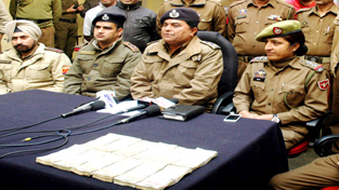 SP City Shiv Kumar Singh Chouhan interacting with media persons at Jammu on Tuesday. SDPO City Perbeet Singh, SHO City Inspector Shakti Sharma and SHO Bus-Stand Inspector Paramjit Singh are also seen in the picture. -Excelsior/ Rakesh