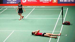 Spain's Carolina Marin (R) reacts after beating India's Saina Nehwal during their final women single badminton match at the BWF World Championships in Jakarta on Sunday. (UNI)