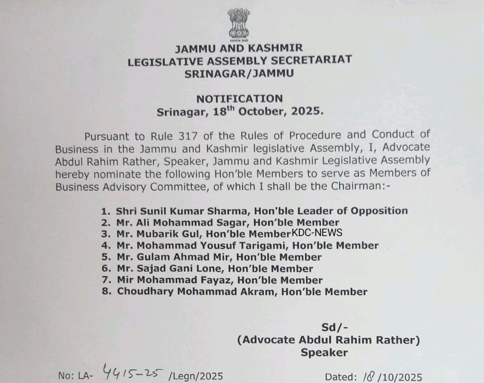 SRINAGAR, Oct 18: The Speaker of the Jammu and Kashmir Legislative Assembly, Advocate Abdul Rahim Rather, on Saturday nominated eight members to the Business Advisory Committee (BAC) of the Assembly.