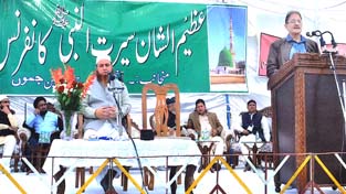 Speaker Kavinder Gupta, along with MLA Jammu East, Rajesh Gupta and other scholars at Seerat-Un-Nabi Conference at Jammu on Sunday.