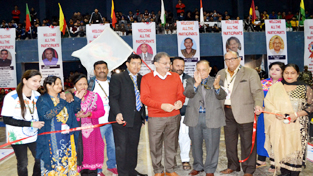 Speaker Legislative Assembly, Kavinder Gupta posing with other members of the Association during day-2 of the Speedball Championship in Jammu.