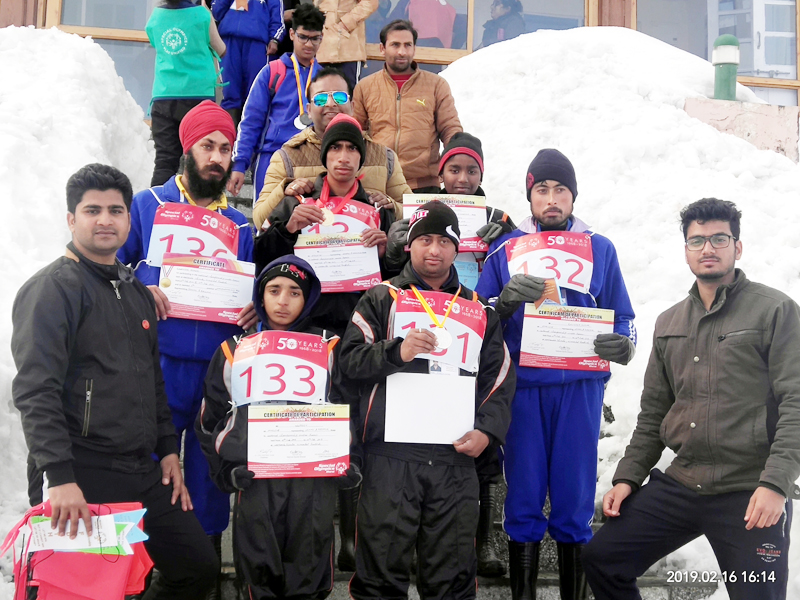 Special athletes posing for a group photograph after winning medals at Nationals.