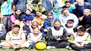 Specially abled footballers posing for a group photograph alongwith Chief Minister, Mehbooba Mufti and Minister for Sports, Moulvi Imran Raza Ansari in Srinagar.