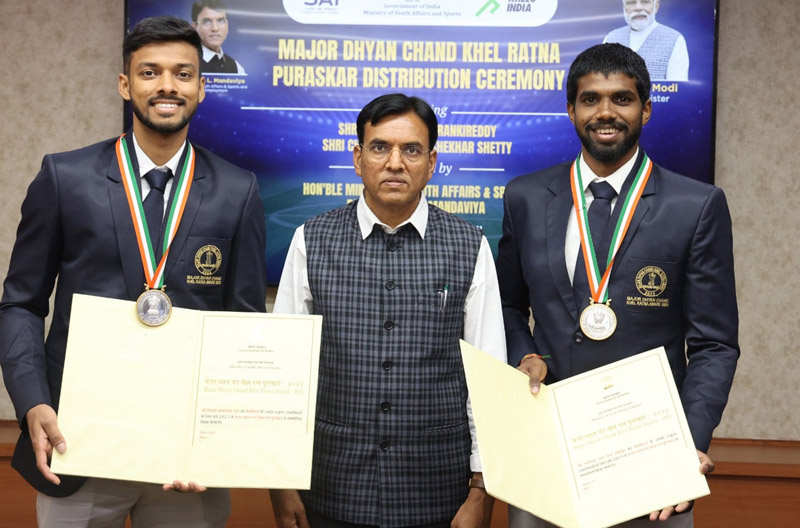 Sports Minister Mansukh Mandaviya presented the Major Dhyan Chand Khel Ratna award to badminton stars Chirag Shetty and Satwiksairaj Rankireddy here on Thursday, completing a long-pending felicitation of the celebrated duo.