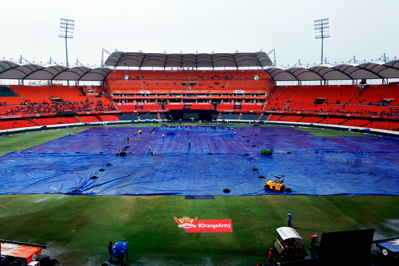 The toss didn’t happen at scheduled time of 7 pm due to rain and wet outfield. The rain intensified before settling into a steady shower as the covers and outfield stayed covered.