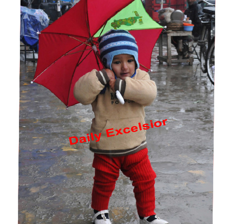 SRINAGAR : A child shielding herself under umbrella after heavy rains hit plains in Kashmir valley and upper reaches receive fresh snowfall. Mercury dips abruptly after rains hit plains in Kashmir and upper reaches receive fresh snowfall of the season, in Srinagar on Friday. Photo/Mohd Amin War