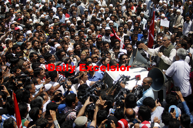 June- 13,2015- SRINAGAR : Jammu and Kashmir former Chief Minister Omar Abdullah addressing a massive Public gathering at Regal Chowk in Srinagar on Saturday during a massive protest against “failures of BJP-PDP coalition government”. Thousands of National Conference workers and activists led by former Chief Minister and the Party Working President Omar Abdullah Saturday marched from Regal Chowk to historic Clock Tower in Lal Chowk Srinagar. Photo/ Mohd Amin War