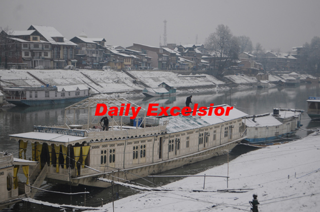 SRINAGAR: Kashmiri boatman removes snow from his house boat at Jhelum river during a fresh snowfall in Srinagar on Monday. The 300-Km-long Srinagar- Jammu National Highway closed has been for traffic due to heavy snowfall in upper reaches in South Kashmir’s Anantnag district. Excelsior/Mohd Amin War