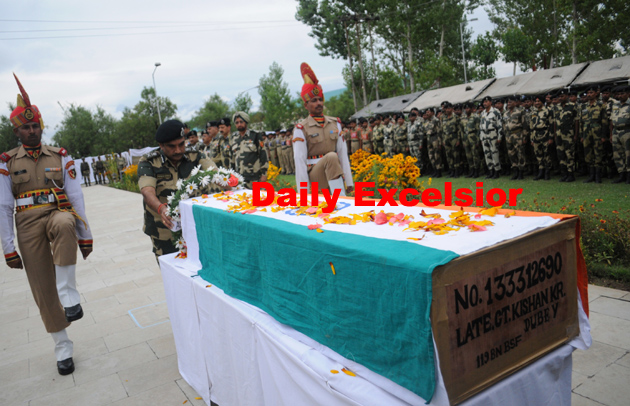 July-102015- SRINAGAR : Mahesh Kumar Singla, Additional Director General, BSF (Western Command), BSF floral tributes to a BSF jawan Krishna Kumar Dubey during wreath laying ceremony at the Frontier headquarter Humhama in the outskirts in Srinagar, on Friday. Kumar was killed in Pakistani sniping on the LoC in Nowgam sector in North Kashmirs Baramulla district yesterday.Photo/Mohd Amin War