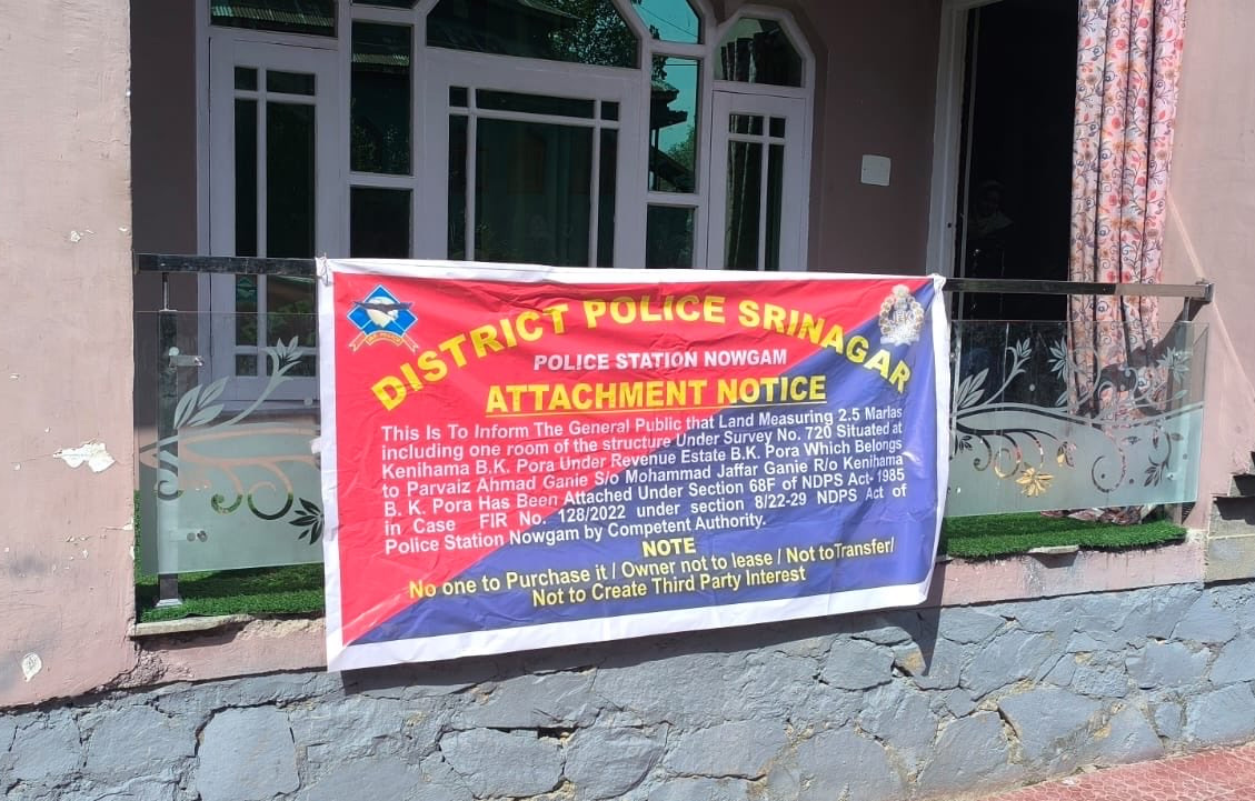 Police said Parwaiz Ahmad Ganie has been named in FIR No. 128/2022 under Sections 8, 22, and 29 of the NDPS Act at Police Station Nowgam. During investigation, it was established that he holds a share in the said property, including a room in the residential house and 2.5 marlas of land. Acting on these findings, the property was attached under Section 68-F of the NDPS Act.
