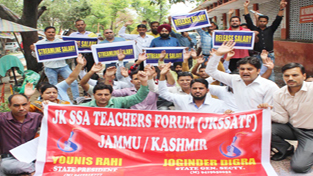 JAMMU, June 19: Deman-ding release of their pending salary and streamlining of the same, Government teachers working under SSA scheme held a strong protest demonstration, here today.