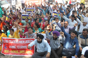 JAMMU, May 9: Demanding regular salaries, teachers under Sarav Shiksha Abhiyan today held a strong protest demonstration.