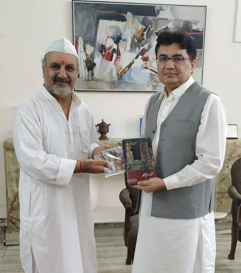 JAMMU, Aug 6: Save Sharda Committee (SSC) Head & Founder, Ravinder Pandita called on Charge’ de Affaires and acting High Commissioner of Pakistan in India Aftab Hasan Khan, in New Delhi today. He presented a book on Sharda, as desired by him, authored by Raja Nazar Buniyari that was recently released in Srinagar Kashmir.