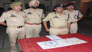SSP Jammu Atul Goel and senior police officers with stolen jewellery recovered from a thief at Pacca Danga police station on Monday. -Excelsior/ Rakesh