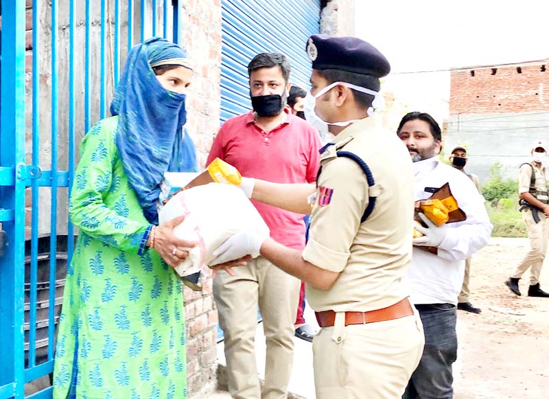 SSP Jammu Sridhar Patil along with Chairman Team Jammu Zorawar Singh Jamwal distributing dry ration to stranded people in Janipur.